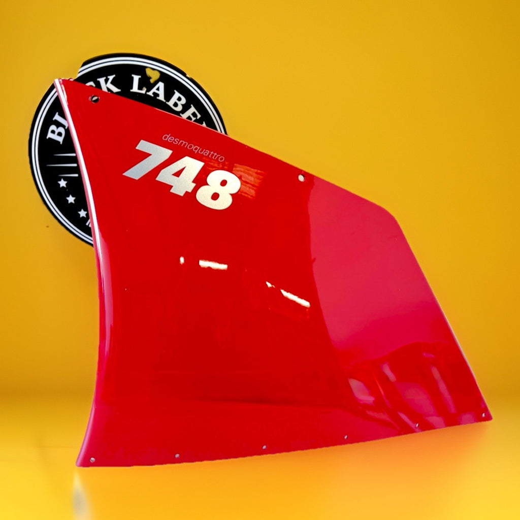 This Genuine Ducati 748 02-04 LH Mid Panel Plastic Fairing in red is a high-quality, refurbished part made of durable plastic. It is designed specifically for the left side of the motorcycle and features pre-drilled mounting holes for easy installation. This fairing is a genuine Ducati product, manufactured in Italy, and comes in a vibrant red color. The finish is professionally repaired and repainted, ensuring a perfect fit and long-lasting durability. Ideal for motorcycle enthusiasts looking to replace or upgrade their mid panel fairing with a genuine Ducati part.