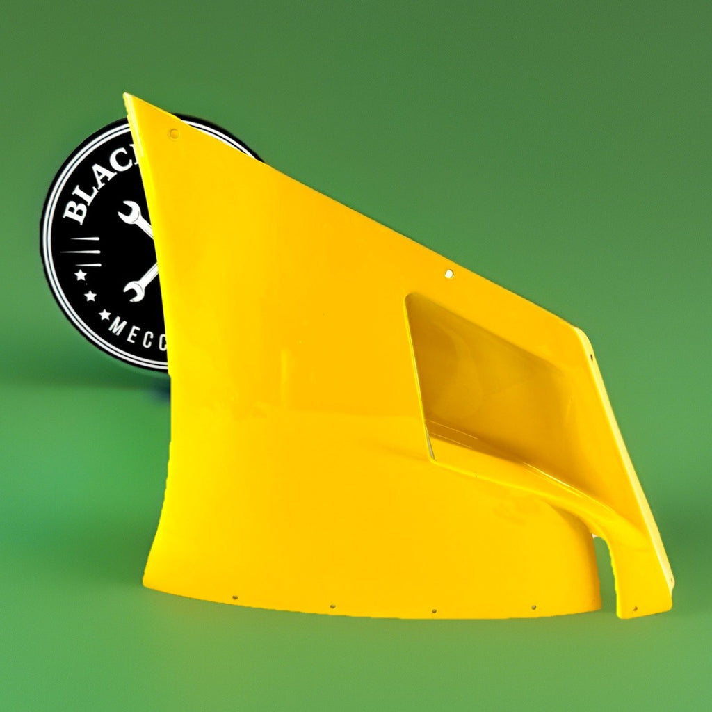 This product is a genuine Ducati 996 748 916 yellow mid fairing cowling left, made of ABS plastic and pre-drilled for easy installation. It is a non-domestic, single piece item manufactured in Italy, featuring a painted finish. This side fairing is designed for the left side of the vehicle and is a high-quality replacement part with the manufacturer part number 48010391A. Please note that this item is used . It can be used as is or you can restore it to it original aesthetics by having it professionally painted