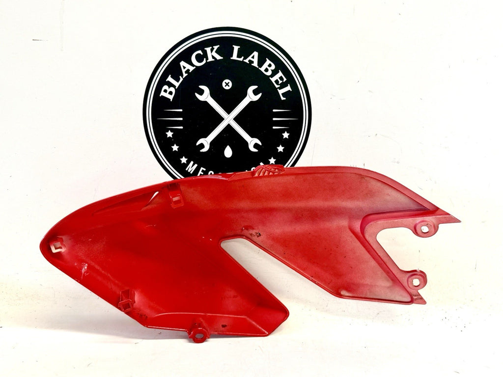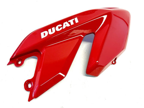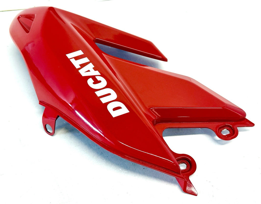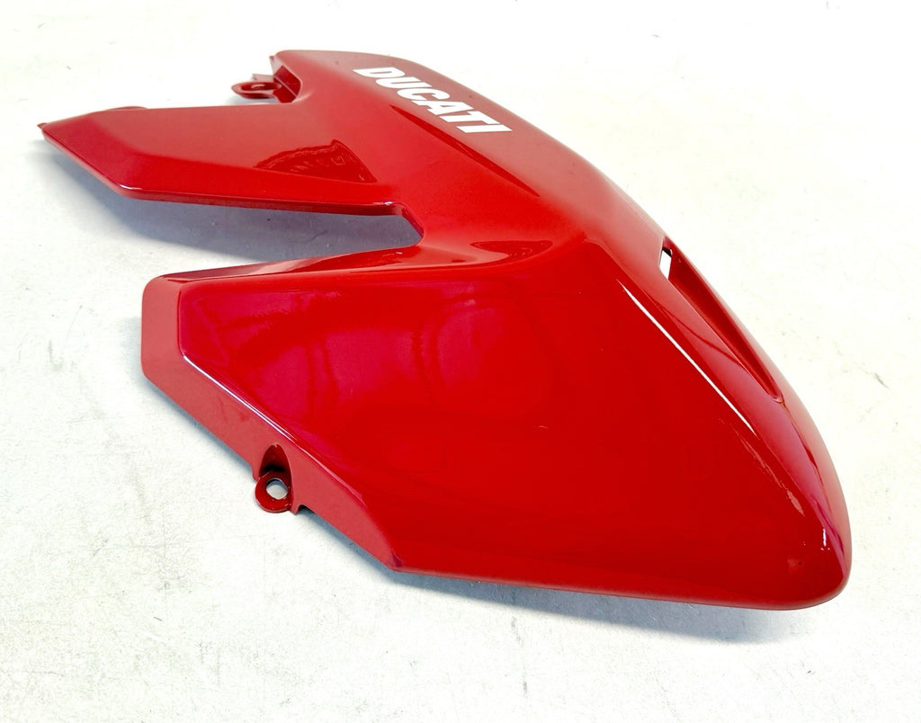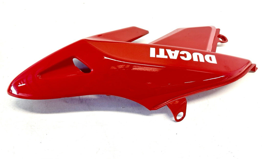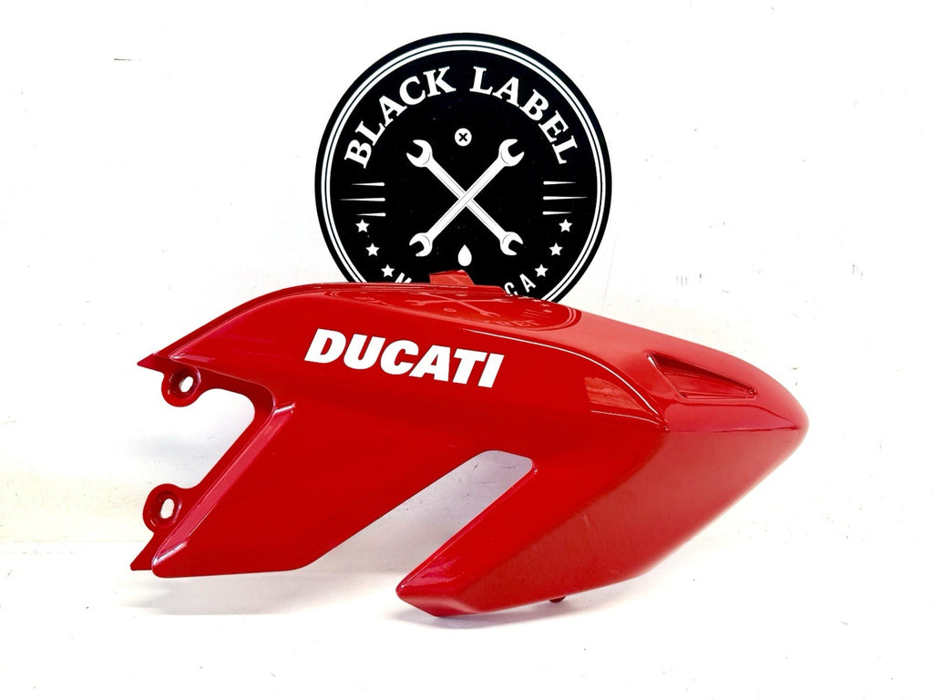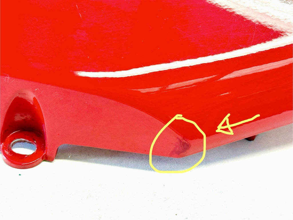 This Genuine Ducati Hypermotard 1100 S Front Right Fairing Tank Cover in red is a high-quality ABS piece manufactured in Italy. It is designed specifically for the Ducati brand and comes as a single piece with the OE/OEM part number 48012501A. The fairing is located on the upper front right side of the vehicle, providing a sleek and stylish look for the motorcycle. This product is a direct fit for the Ducati Hypermotard 1100 S model, ensuring a perfect and authentic appearance for the rider's bike. Any damage or imperfections are depicted in the pictures and circled in yellow