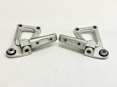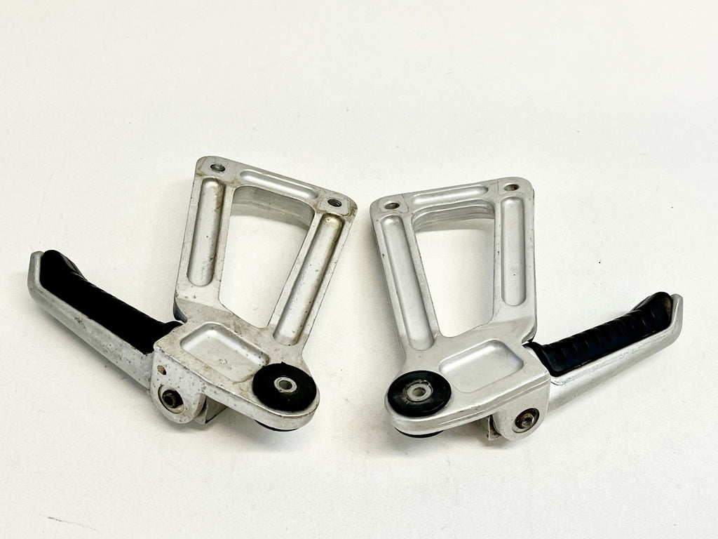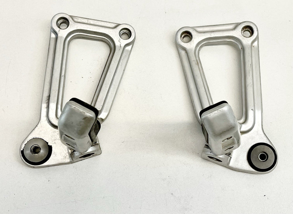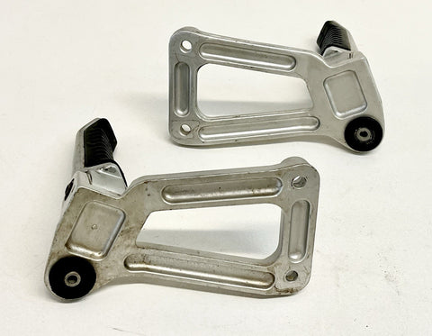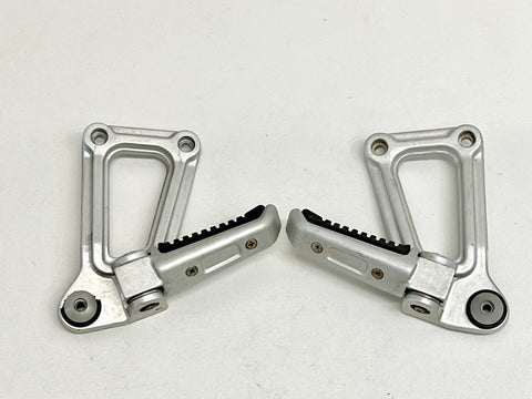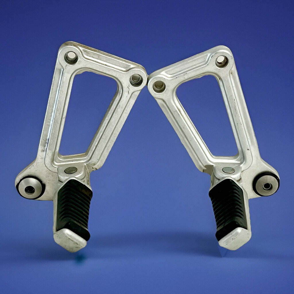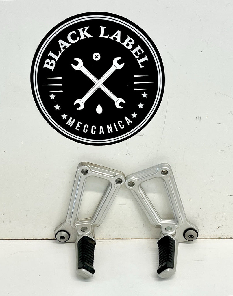 The product is a genuine Ducati pair of passenger peg assemblies in silver, designed for models from 1991-1998 900SS SP CR FE SL. Made of aluminum, these foot pedal mounts are easy to install and foldable for convenience. Manufactured in Italy, these OEM finished pegs are placed on the left and right sides of the vehicle.