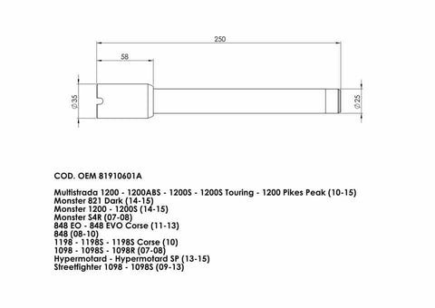 This genuine Ducati front axle is suitable for various models including the 848, 1098, 1198 Multistrada, and Monster 1200. It is made of sturdy steel material and has been manufactured in Italy to ensure high quality. The axle is perfect for replacing a worn or damaged one and is easy to install. The OE/OEM part number is 81910601A, and it can be placed on the front wheel of the motorcycle. Get this reliable and durable Ducati front axle for your motorcycle today!