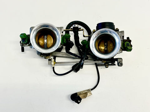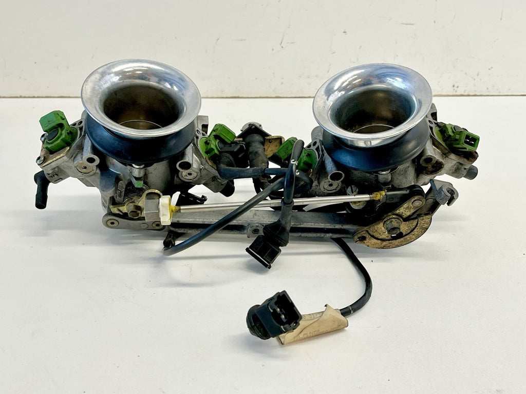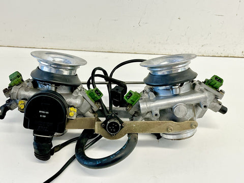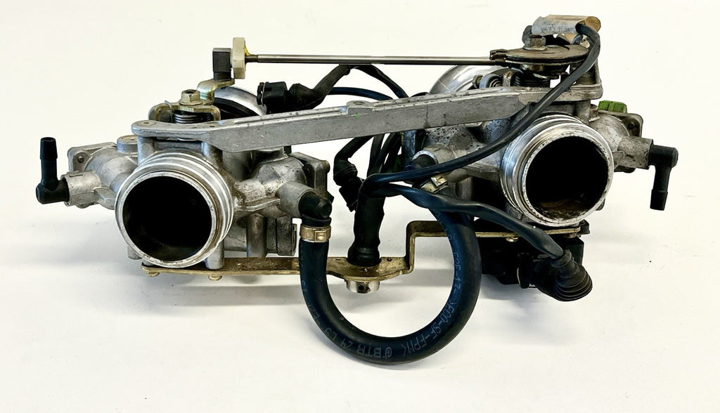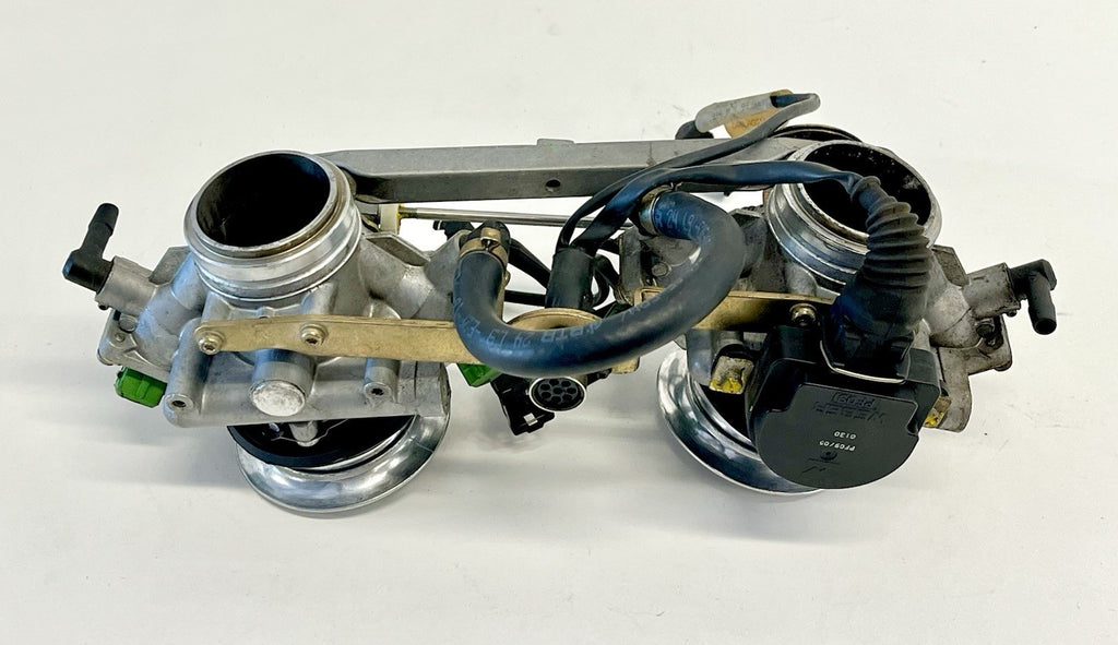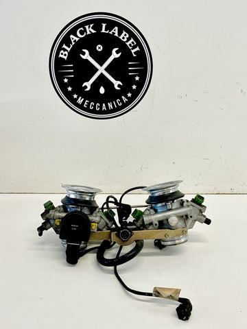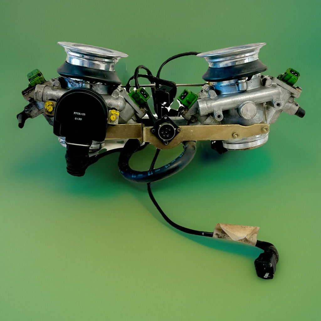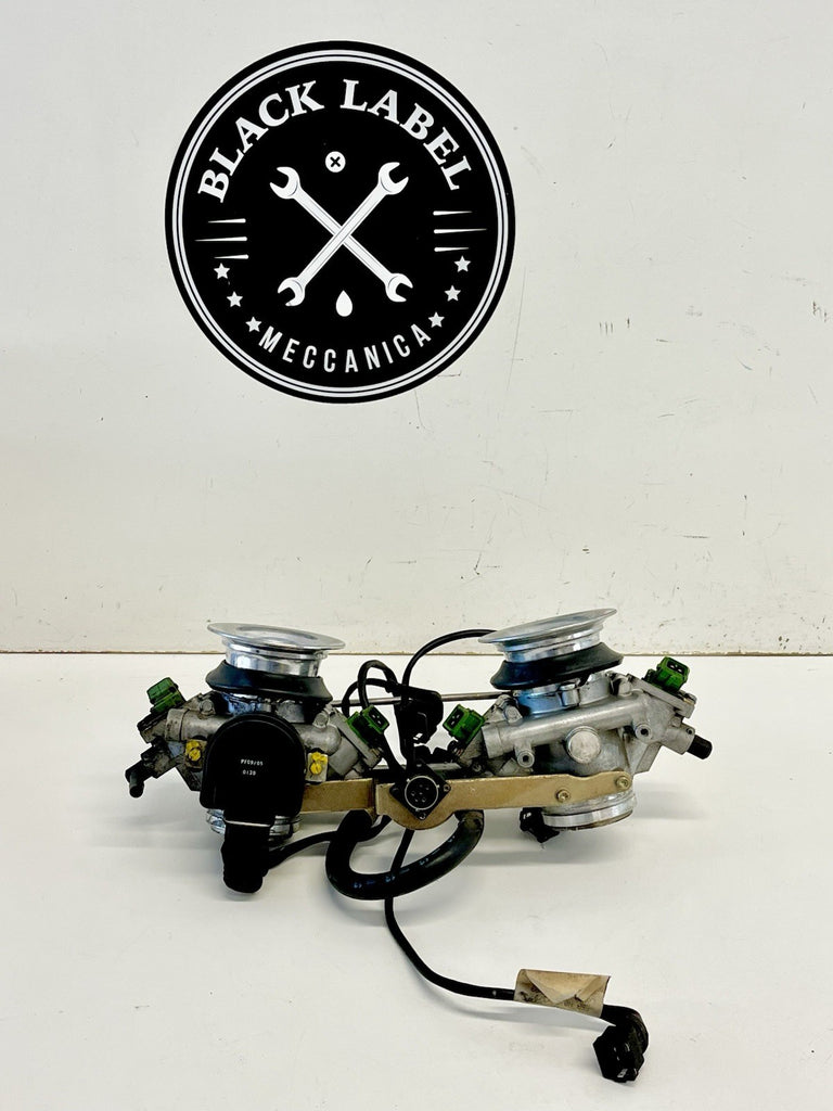 The product is a set of Ducati 916 996 Throttle Bodies with Dual Injectors and Fuel Lines, made in Italy. These electronic throttle bodies are designed for dual fuel functionality, providing efficient fuel delivery to the engine. Ideal for motorcycle enthusiasts looking to upgrade their air intake and fuel delivery system, these high-quality parts offer reliability and performance for Ducati motorcycles.