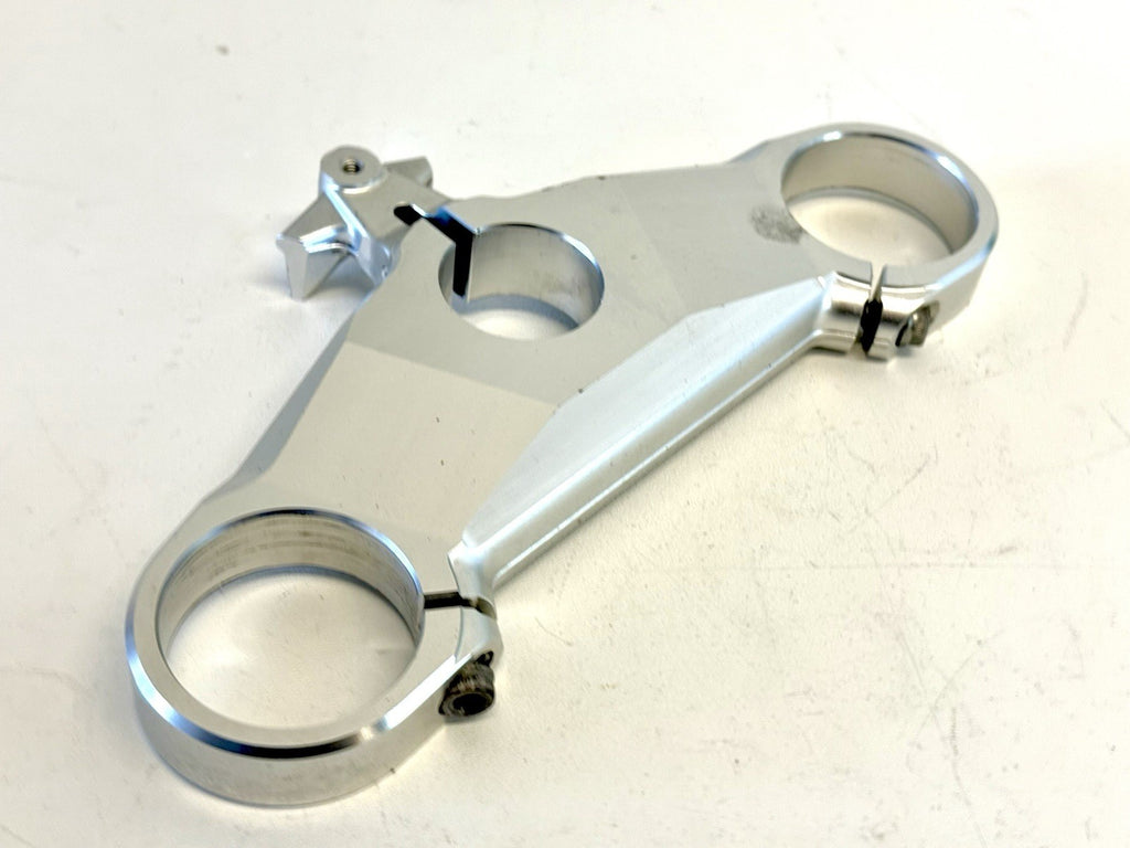 The Ducati 07-14 848-1098-1198 Showa Fork Top Yoke Triple Clamp 34130631A is an upper triple tree designed specifically for Ducati motorcycles. This genuine part from Italy includes the upper tree clamp and is used on the front of the vehicle. Perfect for suspension and handling, this top yoke triple clamp is a reliable and high-quality replacement part for Ducati bikes.