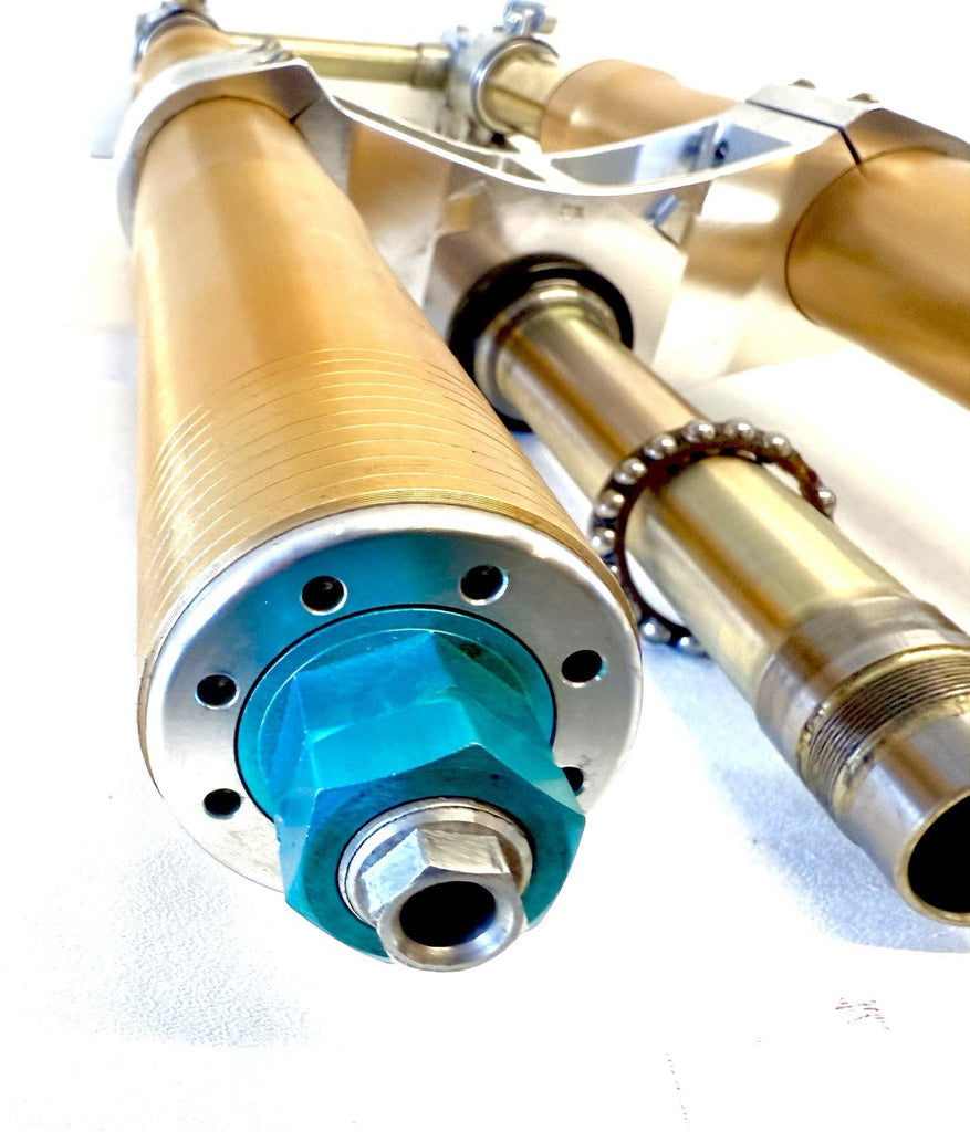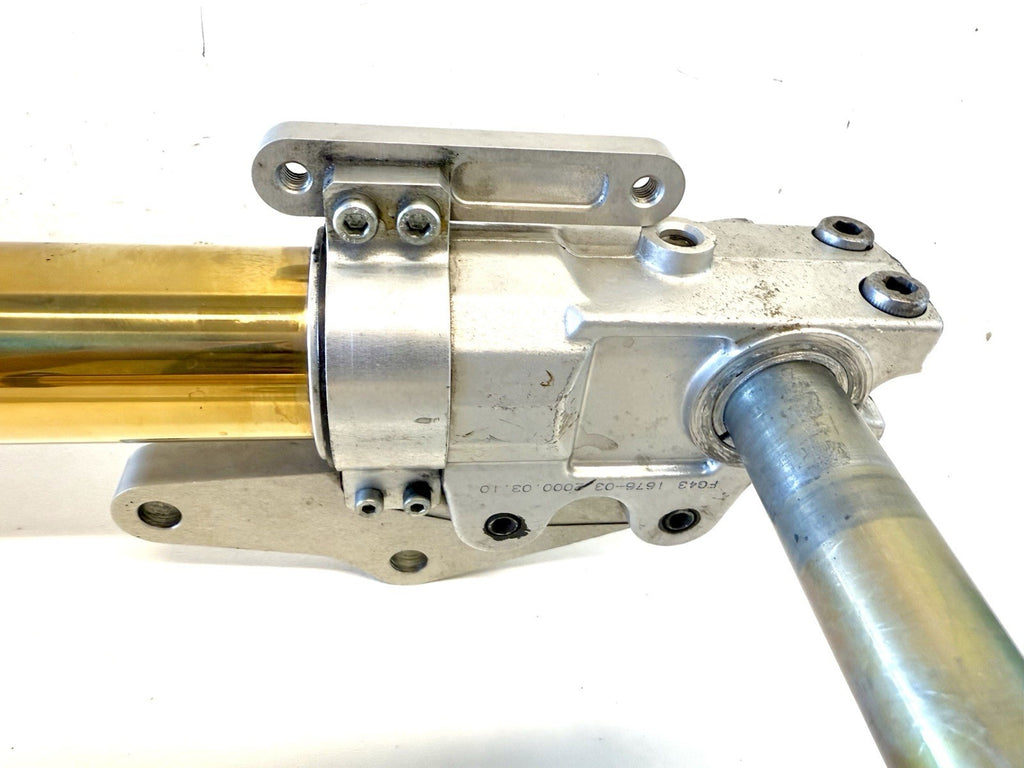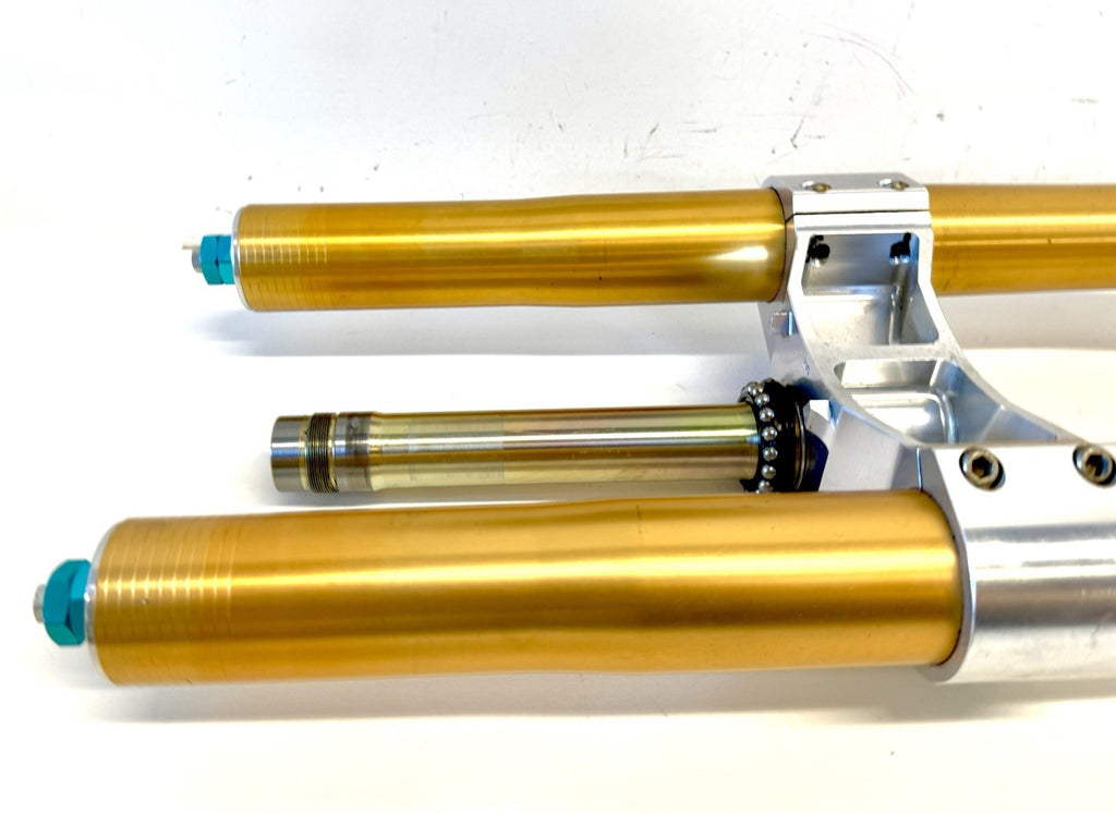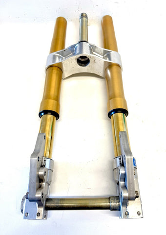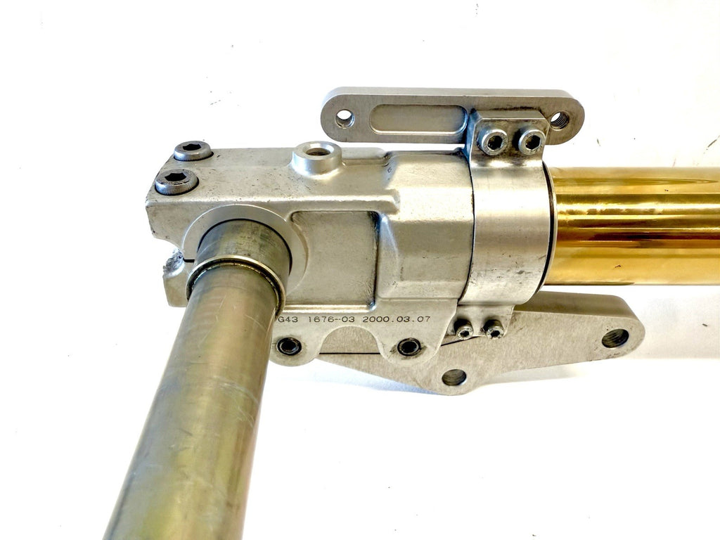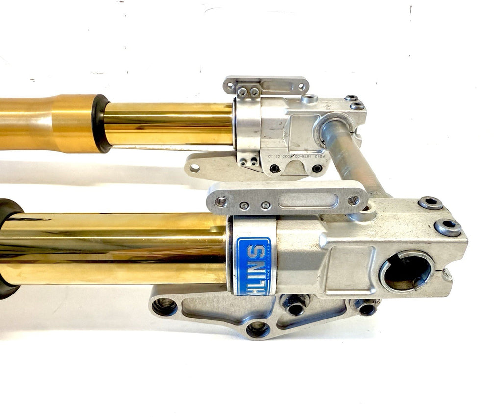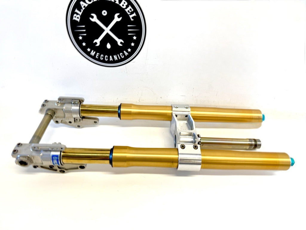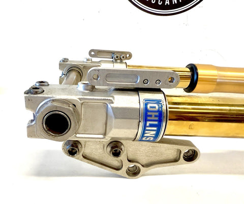 The product is a set of genuine Öhlins FG43 fork legs for Ducati motorcycles, specifically the 916, 996, 998, 748, and 996SPS models. These high-quality fork legs are made of aluminum and stainless steel, with an outside diameter of 56mm. Manufactured in Sweden, they come with a bottom clamp for secure installation on the left and right front of the vehicle. Ideal for motorcycle enthusiasts looking for top-notch suspension components for their Ducati bikes.