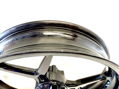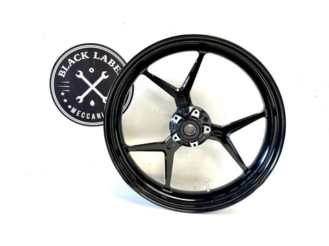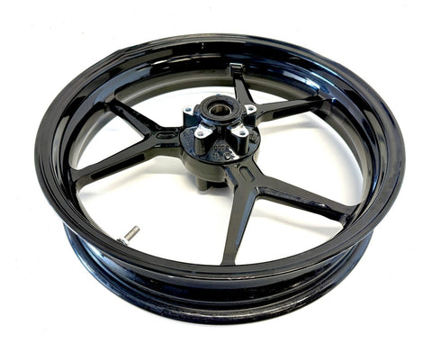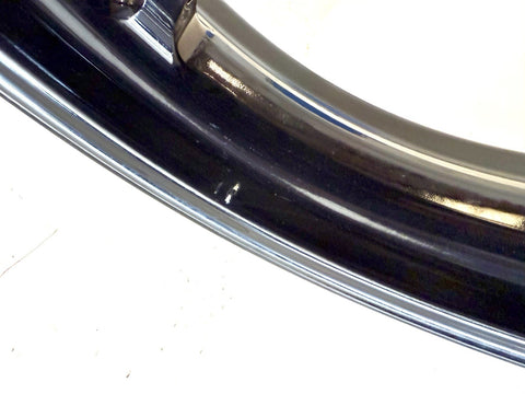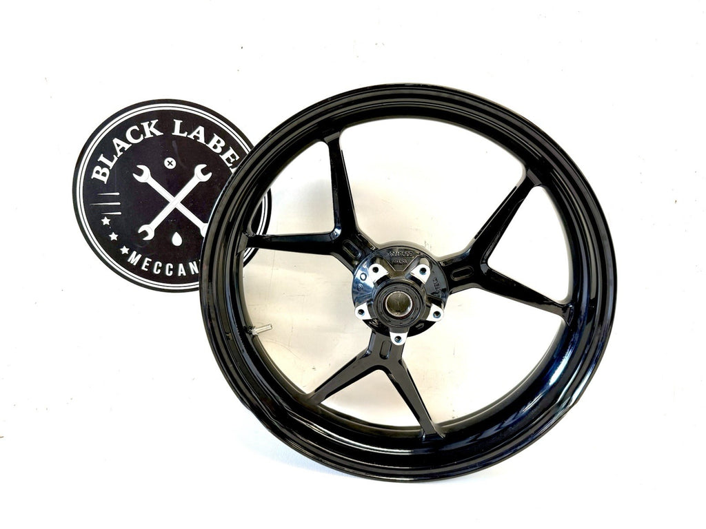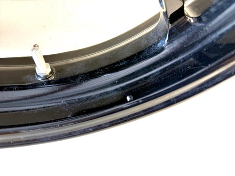 The product is a genuine OEM Ducati Monster 1200 S front wheel rim in black, with a diameter of 17 inches and a width of 3.5 inches. It is manufactured in Italy and features a painted finish. This one-piece cast wheel is designed for the front placement on the vehicle, making it a high-quality and durable replacement or upgrade part for motorcycle enthusiasts looking to enhance their Ducati Monster 1200 S. This wheel is straight and true and does come with a few paint chips . Look closely at pics