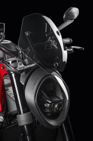 Elevate your Ducati Monster's aerodynamics and style with the Ducati Performance Smoke-Tinted Windscreen. Designed specifically for the Monster 937, this windshield ensures a perfect fit and an improved ride thanks to its light smoke glass tint that enhances visibility while reducing glare. The easy installation feature makes it a breeze to mount, and being a genuine Ducati Performance part, you're assured of its superior quality and craftsmanship.