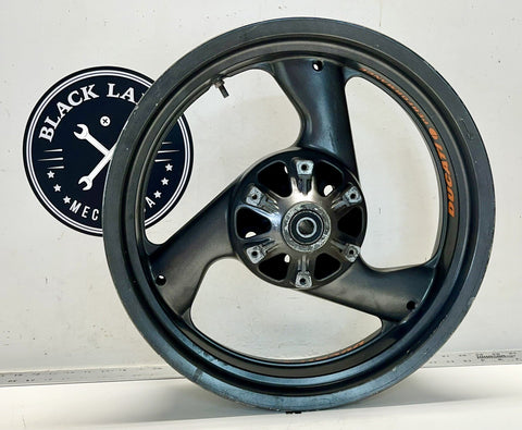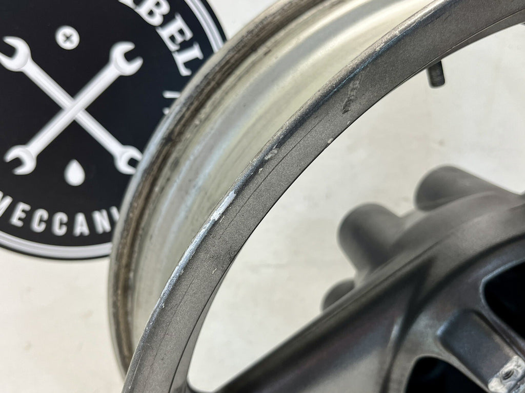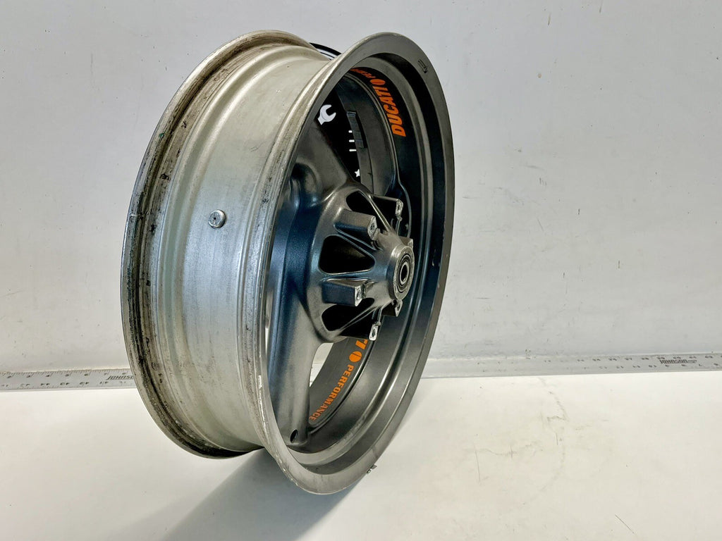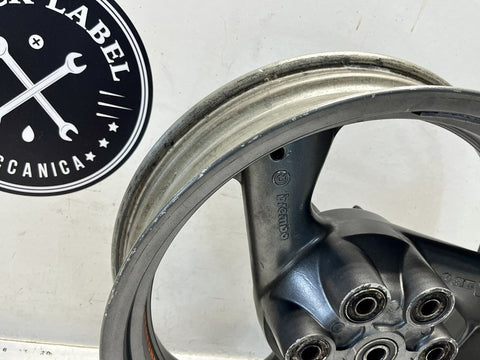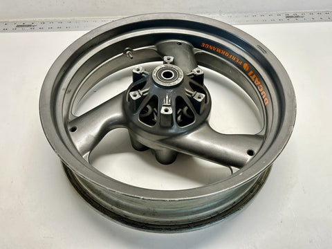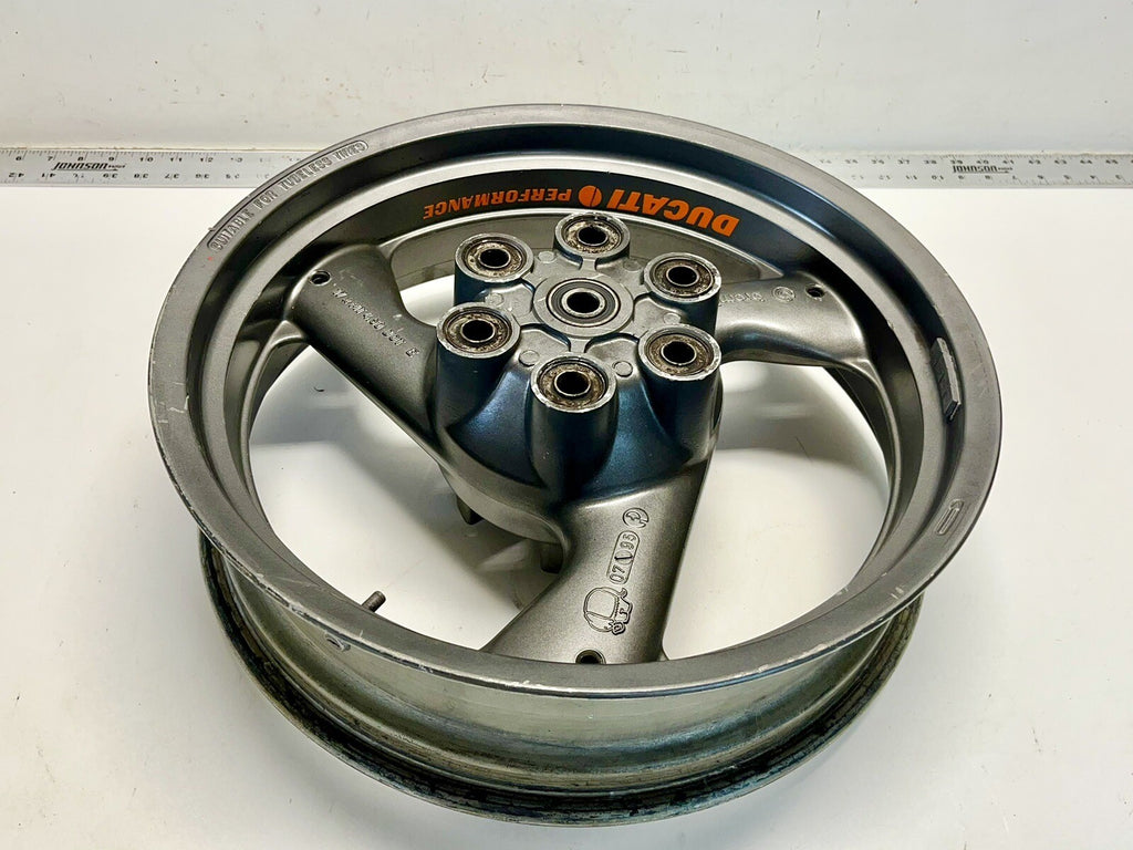 For sale is a rear wheel for a Ducati motorcycle, compatible with models from 1991 to 1998. The wheel is a 3 spoke Brembo design in silver color. It is in good working condition and ready to be installed on your bike. Suitable for use as a replacement or upgrade to your current wheel. Paint has scratches and is not original. Wheel is 100% straight